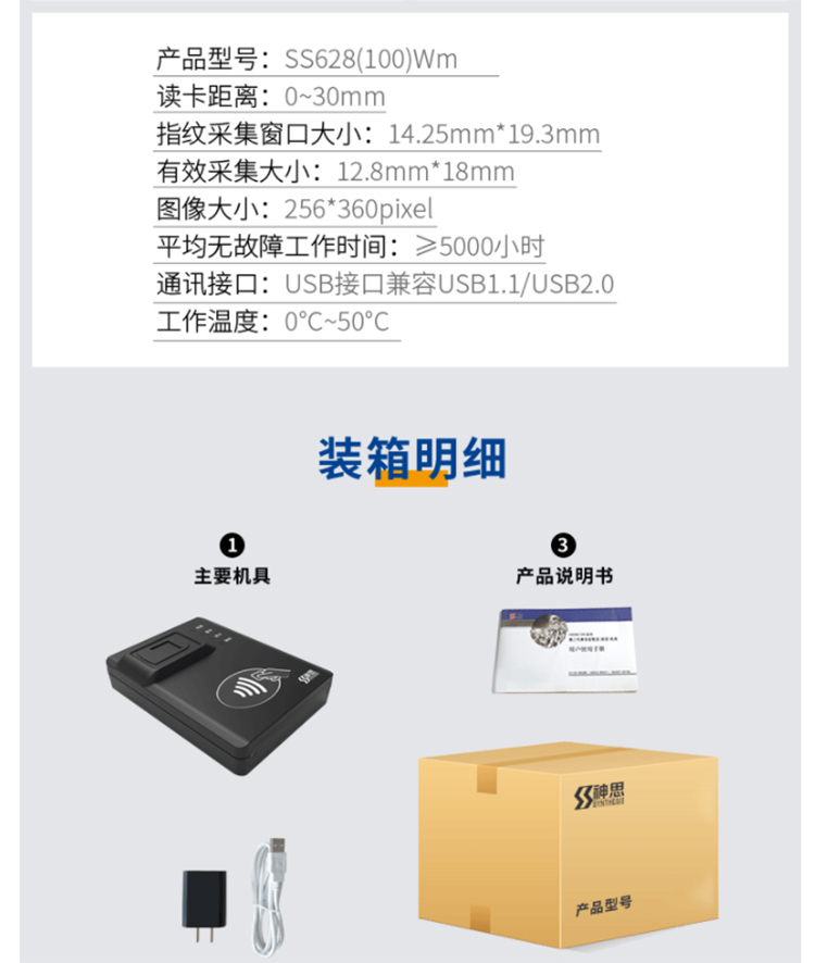 (*由于產品升級或其他原因,神思SS628-100Wm藍牙身份證讀卡器產品實際參數有可能變更,以實際產品為準。本文中的所有陳述、信息和建議也不構成任何明示或暗示的擔保)