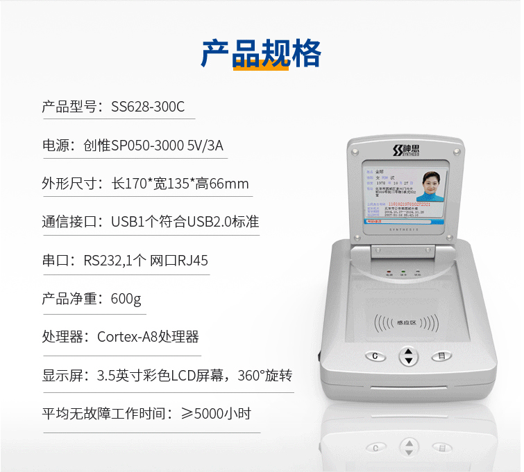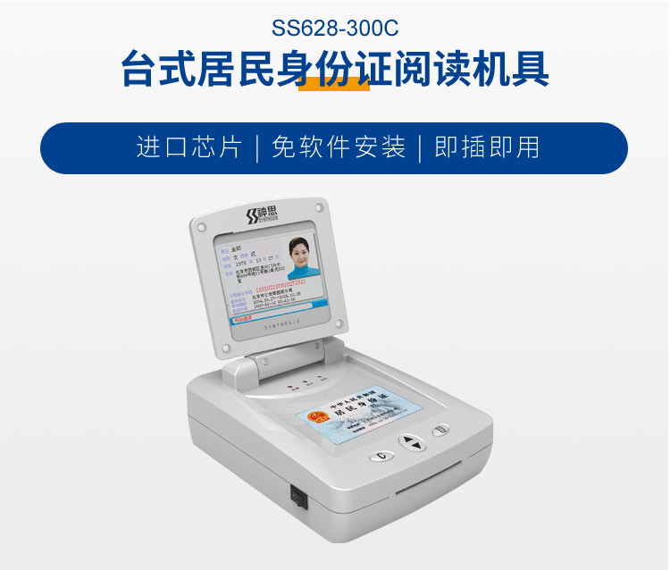 神思SS628-300c臺式居民身份證閱讀機具是神思一款帶屏幕的身份證讀卡器,可以直接讀取身份證信息