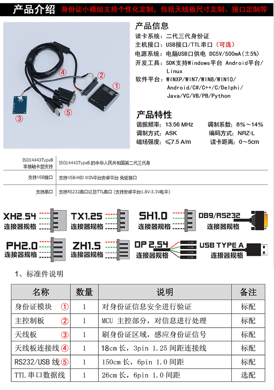 中控身份證讀卡器大模組支持多種通信方式,包括 USB 接口、TTL 串口、RS232 串口